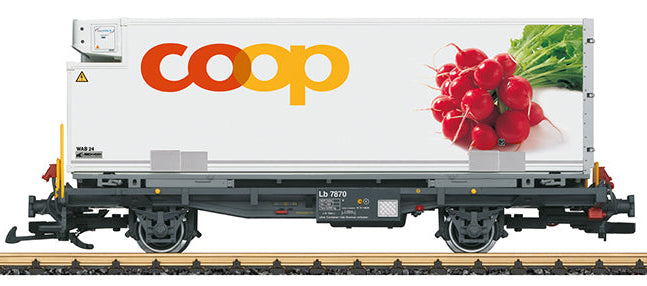 Containerwagen der RhB in der aktuellen Epoche VI-Ausführung. Mit diesen Modell erscheinen weitere Containerwagen mit der typischen Werbung der Handelskette “coop®“. Wagen mit den Motiven Radieschen. Wagen mit neuer Wagennummer in vorbildgerechter Umsetzung. Länge über Puffer je 41 cm.