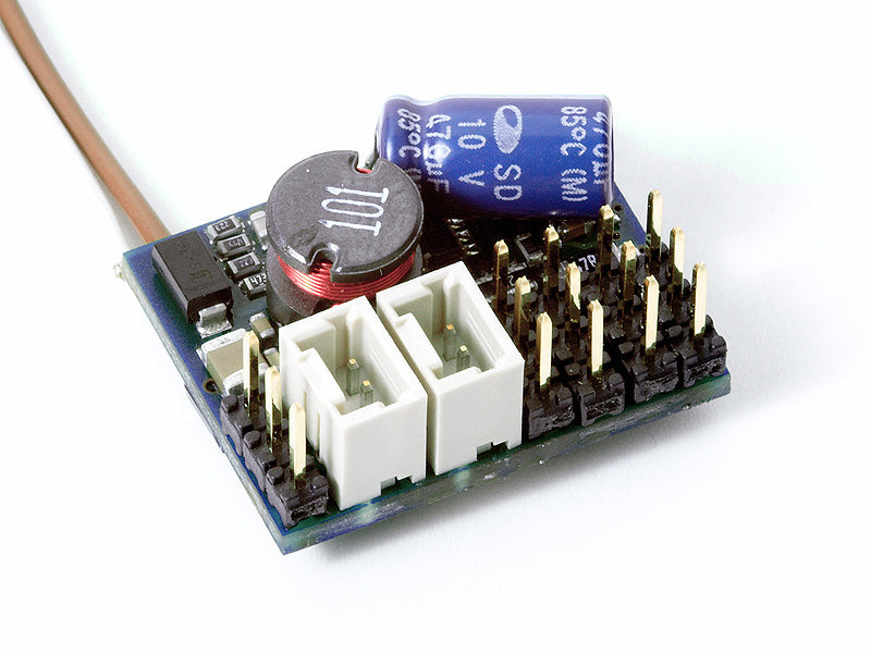 Der 8FS Servodecoder bietet 8 Funktionsausgänge mit der speziellen Möglichkeit Servos und Automatische Entkuppler direkt aufzustecken. Ein 6V Festspannungsregler für den Servobetrieb ist bereits integriert. Erstmals ist auch eine gesonderte Programmieradresse vorhanden. Damit kann der 8FS auch im eingebauten Zustand jederzeit separat programmiert werden (POM). Die max. Belastbarkeit liegt bei 500mA.