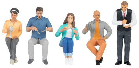 Eet, drink en geniet! Vijf moderne restaurantgasten en een attente ober brengen authentiek leven in je scènes. Twee gasten grijpen al naar hun messen en vorken, terwijl een vrouw ontspant en van haar drankje geniet. Een andere gast leunt achterover met een bierpul in zijn hand. De ober neemt de bestelling op met een vriendelijke glimlach. Perfect voor het ontwerpen van restaurants, straatcafés of biertuinen - voor realistische alledaagse scènes in je modelbouwwereld.