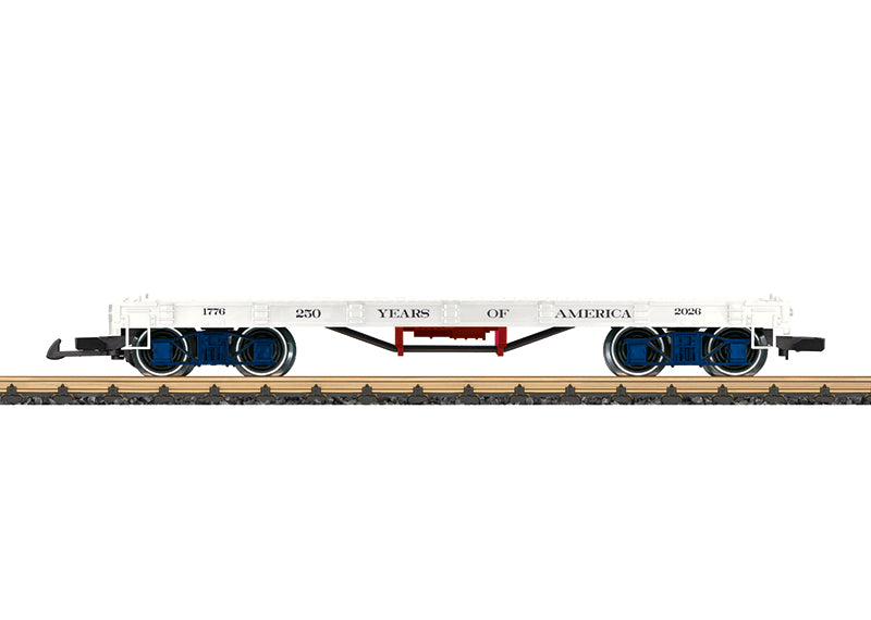 2026 wiederholt sich die Unterzeichnung der Unabhängigkeitserklärung in Amerika. Zu diesem Jubiläum bringt LGB ein Sonderwagen heraus. Flachwagen in den US-Farben gestaltet. Wagenboden aufwendig mit verschiedenen Bilder zum Thema Unabhänigkeit bedruckt. Passende Beladung der Liberty Bell. Beiligende Rungen in den US-Farben. Metallradsätze. Länge über Kupplung 42 cm.