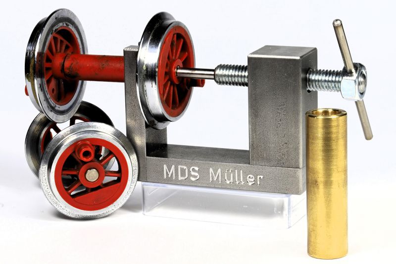 Bei Reparaturen und Umbauten von Spur G-Modellen wird es immer wieder notwendig die Räder von den Achsen zu entfernen. Als praktisches dient dieser Radabzieher. Das Werkzeug ist in einer sehr massiven Ausführung aus gefrästem Metall hergestellt und erlaubt Räder bis zu einem Durchmesser von 60 mm schonend abzuziehen. Der Abzieher wird im Set mit einem Messingdrehteil geliefert. Dieses erlaubt das materialschonende Aufpressen von Antriebszahnrädern auf die passendende Position auf der Antriebsachse. Beides sehr nützliche Werkzeuge, die in keiner Umbau- und Reparaturwerkstatt fehlen sollten.